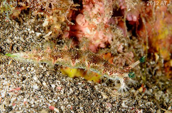 This was our third dive on the Pa Siren and second around the black sands of Sangeang Island. Highlight of this dive was the sea fan with resident pygmy seahorses. With the aid of the +2.5 diopter lenses in my mask, I was actually able to see these tiny fish for the first time (not through the camera). There were many different species of nudibranchs. |
