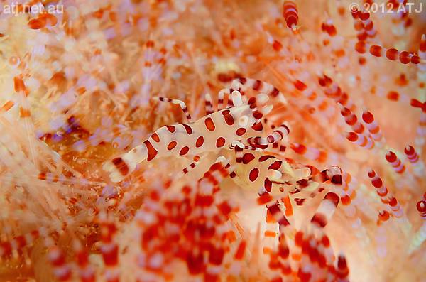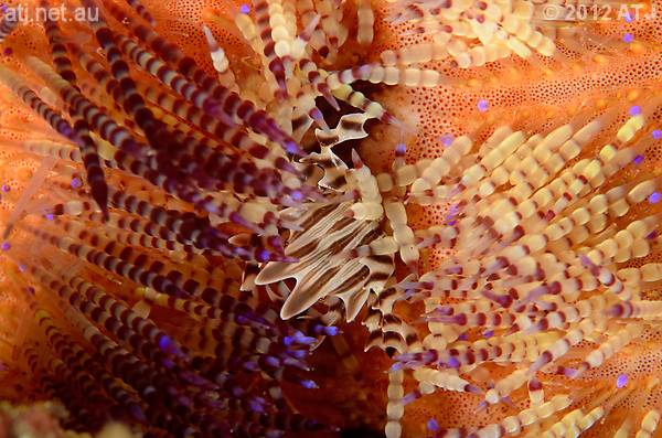 Coleman shrimp, Periclimenes colemani, on fire urchin, Asthenosoma ijimai. 21.7 m. |