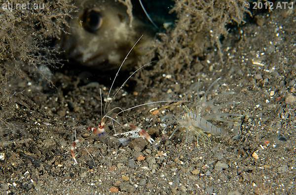 Juvenile banded coral shrimp, Stenopus hispidus, with juvenile lionfish, Pterois volitans. 12.3 m. |