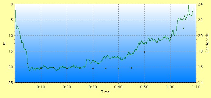 Entered at The Leap and went straight to the sand line. Headed north slowly along the sand line looking for anglerfish and also the cowrie. Found the cowrie but no anglers. Carefully checked Seahorse Rock but found no seahorses. Found "Bob" on his new low rock. No sign of "Rosie". Checked for the basket star on its usual sponge and then found "Southern Cross", "Kel" and "Richie". Carefully searched through the sponge covered rocks amongst the kelp up from the sand line closer to The Steps. We didn't find any anglerfish or seahorses. Exited at The Steps. |