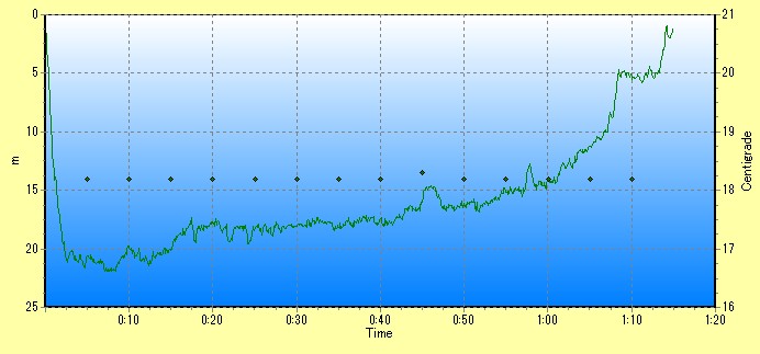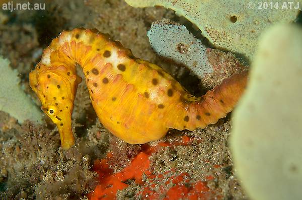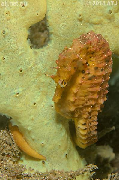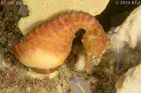 Female pot-bellied seahorse, Hippocampus abdominalis, ("Rosie"). 20.6 m. |