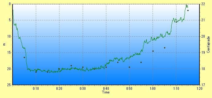 Female pot-bellied seahorse, Hippocampus abdominalis, ("Rosie"). 19.9 m. |