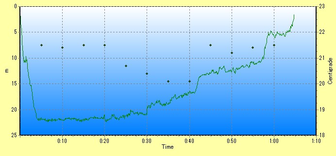 Female pot-bellied seahorse, Hippocampus abdominalis, ("Rosie"). 20.4 m. |