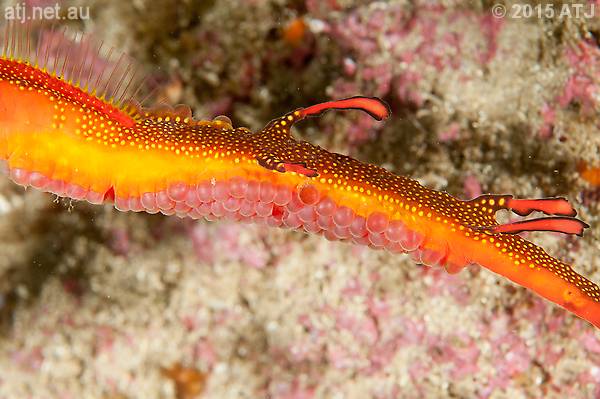 Eggs on the tail of a male weedy seadragon, Phyllopteryx taeniolatus, (PT2015060601). 21.4 m. |