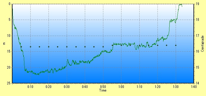 Female pot-belied seahorse, Hippocampus abdominalis. ("Rosie"). 13 m. |