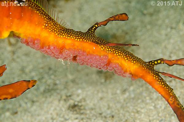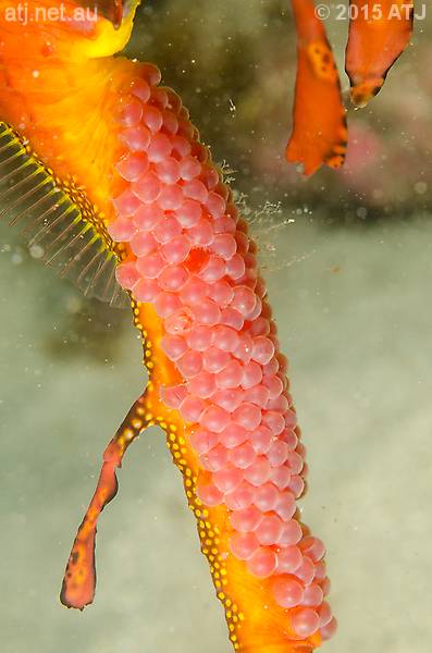 Eggs on the tail of a maile weedy seadragon. Phyllopteryx taeniolatus, (PT2014091301). 15.2 m. |
