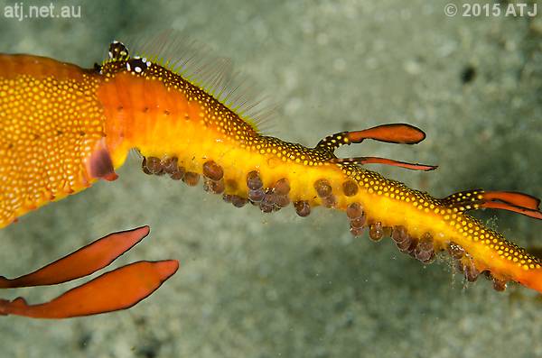 Eggs on the tail of a maile weedy seadragon. Phyllopteryx taeniolatus, (PT2014051701). 18.9 m. |
