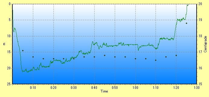 The surface was quite rough despite the low swell forecast. I slid down the wall and on the surface the visibility was probably only 3 metres but the temperature was around 19°C. I descended and swam to the sand line at around 60°. I arrived right in the middle of the amphitheatre to the north of the flat rock with sponges. Visibility here was 10 to 15 metres but the temperature was below 17°. I was regretting diving in my wetsuit. I swam along the sand line towards The Steps. Behind Seahorse Rock I came across a large lion's mane jellyfish. There have been quite a few around lately. I had a look in a cave on the sand at the base of the wall behind Seahorse Rock. I was surprised to see a snake eel in the sand. Unfortunately, it backed it into its burrow before I could get a photograph. I will have to try again on another dive. I continued on to Seadragon Alley. Here I saw 5 weedy seadragons: 2 females (PT2015011102, PT2013122201), a male with eggs (PT2014030803) and two large juveniles (PT2015091101, PT2015050901). I kept on along the sand line and just near Big Rock I found my favourite weedy seadragon (PT2014030901). She's the one with the wavy body. By this point I was pretty cold and my thinking was a little clouded again. I missed the first lot of pygmy pipehorses and diversity rock and only when I saw Little Big Rock did I realise where I was. I back tracked to Diversity Rock where I found "Noel" and "Arnold". I noticed the angler on the rock next to Diversity Rock. I wondered if it was the same one and checked the rock it was on last Saturday only to find the Miamira magnifica in that spot. I came back to Diversity Rock to look for the pygmy pipehorses and found a new male (IL2015101801). It appears he's replaced or displaced the previous male (IL2015091101). I couldn't see the female. I swam back to the other pygmy pipehorses and found both of them, the female (IL2015072601) and the male (IL2015092701). I headed back to Diversity Rock and found "Rosie" on the front and then found the female pygmy pipehorse (IL2015091201). I headed to the other seahorse location where I found "Di" in a sponge but I could not find "Joseph". I need to spend more time looking for him. I headed to the boulders, did my safety stop and exited at The Steps. |