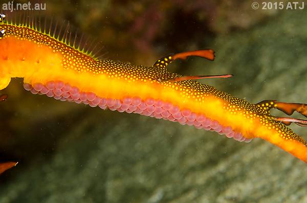 Eggs on the tail of a male weedy seadragon, Phyllopteryx taeniolatus, (PT2014030803). 17.8 m. |