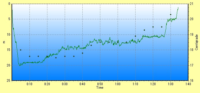 There was hardly a ripple at The Steps when I checked it out before the dive and the swell at The Leap was slight. The surface water looked clean, too, so it augured well for a good dive. We jumped in from the low platform and then swam 20-30m north-west on the surface parallel to the shore before descending. The visibility was at least 10 metres and looked great. I tried to head at 60° but the current was quite strong and we hit the sand line behind Seahorse Rock - although I didn't realise immediately as the visibility dropped to only a few metres once we hit 15m. We swam towards The Steps and as we swam over the rock where the bent stick pipefish has been I realised where we were and swam back to find little "Ronnie", the tiny orange painted angler. I lost Mike at this point. I searched an area only around 30x30cm for "Ronnie" for a few minutes before I spotted the tiny tail poking out from under some algae. It made me realise just how difficult these small anglers are to find. I moved on to look for the bent stick pipefish but was not able to find it. I continued on to Seadragon Alley looking for "Steve", the orange painted angler at the start but was unsuccessful. I caught up to Mike in Seadragon Alley and spotted one weedy seadragon. Despite it nearly being breeding season there have been very few around of late - or perhaps it is just the poor visibility that's made spotting them difficult. We continued on towards Big Rock. I looked in the cave for the upside-down pipefish but couldn't see it. We looked for the ornate ghostpipefish but couldn't find it nor could we find the black angler. My mask had been leaking most of the dive and seemed to get worse here making looking all the harder. I swam past the basket star and on to Diversity Rock. I found "Daniel" and "Noel" in the sponges on the rock behind Diversity Rock but I could not find "Rosie" or "Arnold". Mike thinks he saw "Arnold" in the sponges with the other two but didn't get a photo so can't be sure. The pygmy pipehorse was in the Carijoa behind the white honeycomb sponge. While Mike was photographing the pygmy pipehorse I searched everywhere for "Rosie", although my leaking mask made it difficult. Mike left me to photograph the pygmy pipehorse. I swam on to the other seahorses. "Mikhail" was in the sea tulips in the middle of the rock and "Di" was at the top end. I noticed a White's seahorse in the sea tulips with "Mikhail". It was missing the tip of its tail. As I was looking at it it let go and floated up into the water column. I tried to coax it back to the rock but it kept swimming off so I let it go. Last I saw it was swimming 4 metres off the bottom. I swam to the boulders, did my safety stop and exited at The Steps. The gentle swell made the exit easy. Mike was waiting for me. |