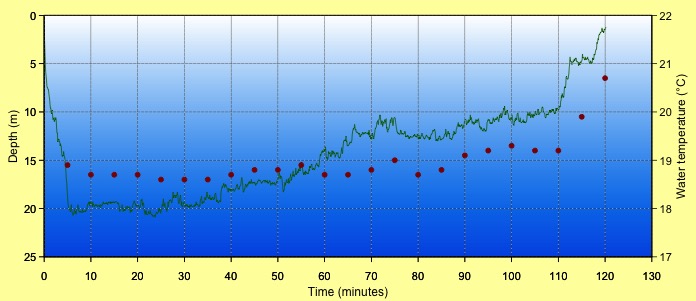 Cody joined me today for a double dive. We would do The Leap for our first dive. I would be using my 7L pony for the first time (even though I bought it more than 3 years ago). I wanted to see how it compared to the 5L pony and how much extra time I'd get for diving from The Leap to The Monument while The Steps was closed. Cody was using 2 x 7L sidemounted tanks. Conditions were calm and the tide was still quite low so the low platform was the place to enter. We jumped in and swam out on the surface. We descended and swam at around 60° to the amphitheatre. We arrived in line with the first rock in Field of Pygmies. The visibility was between 10 and 15 metres, the water temperature around 19°C, and there was only gentle surge. I had a quick look on the rock above the first rock for pygmies and then the first rock itself. It seems all the pygmies are gone or at least I'm not able to find them. We headed to the flat rock with sponges. I looked for the pygmies on top of the rock but could not see them. I then spotted a small female on the side of the rock. I pointed it out to Cody. We swam along the sand line. Just before Ian's Pygmy Rock we came across "Clyde" and another Weedy Seadragon. I don't see "Clyde" all that often so it is good to see him. We continued along the sand line past Seahorse Rock and on to Weedy Overhang. The male weedy was near the overhang. He still has a wound on his side. There was another weedy between the rocks and Cody found a juvenile weedy in the kelp. I looked on the rock above the weedies and spotted a small female pygmy pipehorse. I don't believe I have seen this one before. We continued on to Sheree's Pygmy Rock. I looked for pygmies but was only able to find one small one hiding at the base of the hand sponge. We swam past Southern Cross Rock and on into Seadragon Alley. We found a small adult weedy near the end of Seadragon Alley. We followed the sand line to Big Rock. I spotted and photographed the juvenile Bridled Triggerfish on the sand below Big Rock. We headed up to the large rock near Hand Rock. George's orange Red-fingered Anglerfish was out in the open on the rock. I pointed it out to Cody. We continued along the top of the reef to the white male pygmy pipehorse. I looked for the pink male but could not see him. We swam on towards Diversity Rock and I looked for the white Red-fingered Anglerfish but could not see it. We headed past the basket star and on to the large rock behind Little Big Rock. The grey Red-fingered Anglerfish was on the side of the rock. "David", the Pot-bellied Seahorse, was in the sea tulips on the rock below the large rock. We continued to the large yellow Red-fingered Anglerfish. It has stayed put for a week or so now. We swam past Di's Rock and on to the large orange Red-fingered Anglerfish on the side of the nearby rock. We continued along the reef and spotted a floundering Weedy Seadragon. We're not sure why it was floundering but it didn't look well. We headed to the rocks in front of the exit. I looked for "Raphael", the yellow Red-fingered Anglerfish with pink mask, but could not find him. I did find the small pale orange Red-fingered Anglerfish. We swam to the boulders and as we were ascending to Split Rock I noticed a juvenile Half-moon Triggerfish. I took some photographs and started my safety stop. We finished our safety stops and swam to the exit and got out.