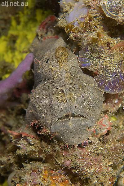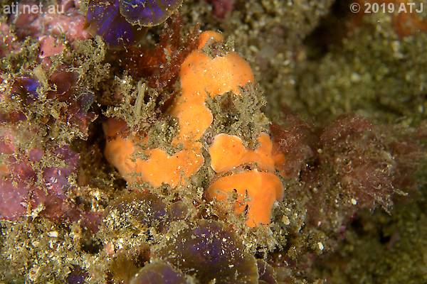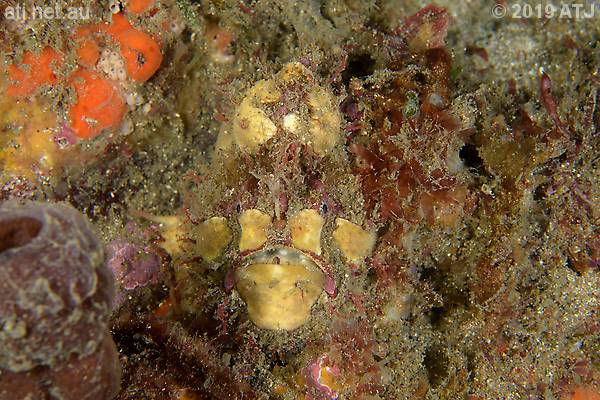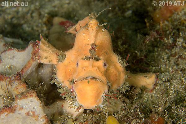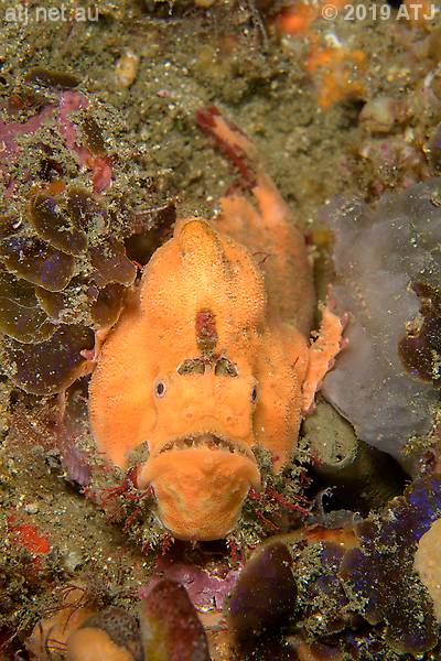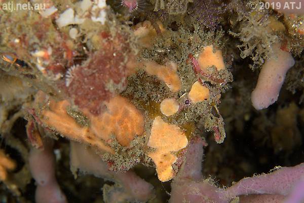 The main aim of today's dive was to try to see 10 Red-fingered Anglerfish on one dive. I dived The Steps yesterday and saw 9 anglerfish. On Friday, Ron showed me another one near The Leap. If I see all of them I should be able to see 10. Cody and Rachael joined me for the dive. Cody was using 2 x 7L tanks side mounted, Rachael had her new stumpy 12.2L tank and I was diving with a 12.2L plus 7L pony with 32% Nitrox. Rachael jumped in from the shelf and Cody and I got in from the low platform. It was quite calm despite a 1.5 to 2 metre southerly swell. We swam out on the surface before descending. We swam at around 60° towards the amphitheatre arriving in the middle of the amphitheatre. The visibility was 10 to 15 metres, the water temperature just under 21°C, and there was very little surge. The current was gentle. I swam straight to the first rock in the Field of Pygmies and had a quick look for the last remaining pygmy. I couldn't find him but I also couldn't find him on Thursday so I wasn't surprised. I swam on to the flat rock with sponges. I looked for the pygmy I found there on Thursday and again on Friday but I couldn't find it. I didn't look for long as I wanted to spend more time looking for anglerfish. We continued along the sand line and I kept one eye out for anglerfish and pygmy pipehorses and the other for Weedy Seadragons. We reached Seahorse Rock and I had not found any. Just after Seahorse Rock I swam to the rock where Ron had shown me a salmon Red-fingered Anglerfish. It was still on the same rock. I had 1 out of 10. When Cody and Rachael caught up up I pointed out the anglerfish and then I spotted two Weedy Seadragons on the sand next to the rock with the anglerfish. One was the male from Weedy Overhang.