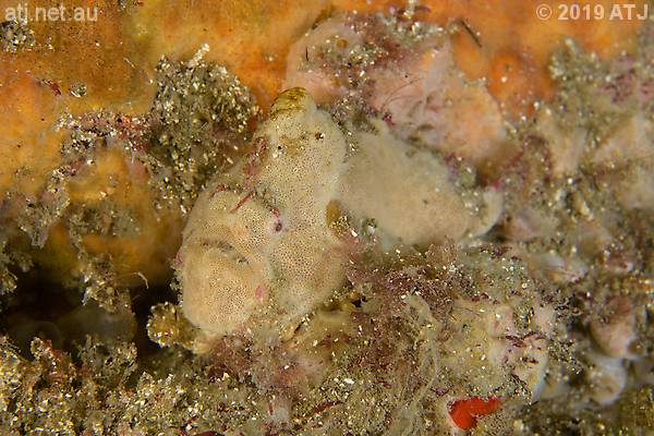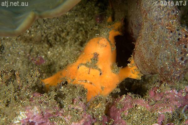 I swam on to Weedy Overhang. I spotted a Reaper Cuttlefish on the sand one the way. There were no weedies under overhang but I spotted another Reaper Cuttlefish on the first of the low rocks with sponges. I looked in the gap after the rock beyond the overhang for weedies. Most of the kelp was gone but I spotted the juvenile weedy in what little kelp remained. I looked for pygmies above the gap but couldn't find any. I swam on ahead of the others to Sheree's Pygmy Rock. I looked for the pygmies there but found only one hiding under the hand sponge. I took some photographs as the Blue Groper hassled me and the others caught up. We continued to Southern Cross Rock. I looked on the side of the rock for pygmies where we used to see them. I spotted a pink juvenile. While I was taking photographs, Cody told me about a Weedy Seadragon I'd missed and I swam back to it. We headed through Seadragon Alley. I was ahead but when slowly so the others could catch up. I spotted a small weedy near the end of Seadragon Alley. As I was there, Jeroen swam up with a friend who he'd brought to Kurnell to see weedies. He told me he'd see a small weedy at 12m back towards The Steps. I suspect it was the juvenile that Georgia found a few weeks ago and I have been seeing regularly near Pipefishes Hole. We made our way to Big Rock. I looked for the juvenile Half-moon Triggerfish but didn't see it. I didn't linger as I was anxious to check for the anglerfish. As I swam up towards the rock where I'd last seen George's orange Red-fingered Anglerfish, I could see it from quite some way away. I was relieved. I took some photographs and pointed it out to Rachael. Jeroen swam up at the same time and assumed I was showing him so Rachael waited.