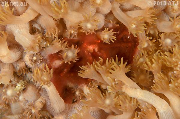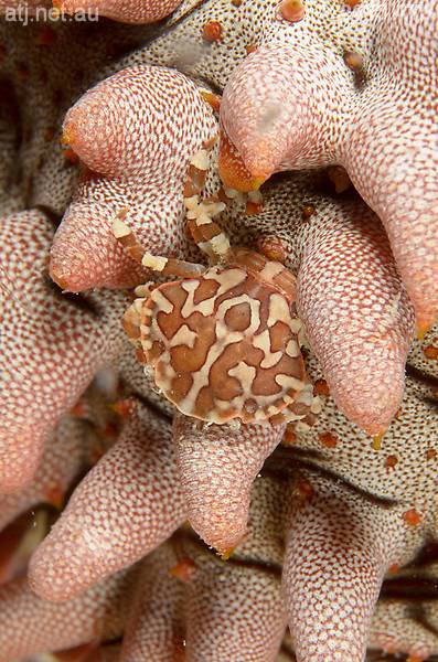 Commensal crab, Lissocarcinus sp., on a sea cucumber.