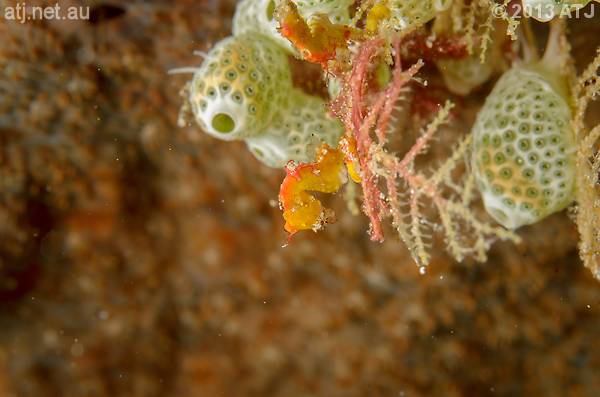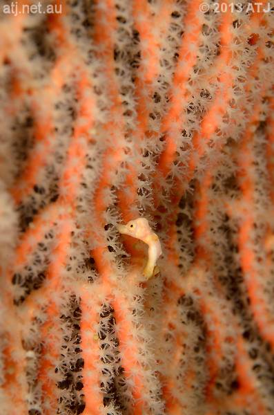 Yellow pygmy seahorse, Hippocampus bargibanti.