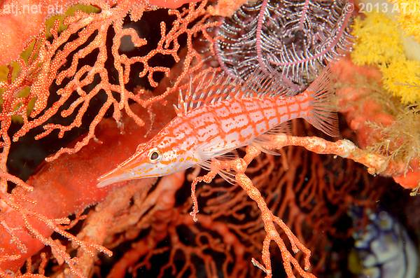 After lunch we sailed 30 kilometres south west for dive 3 which was at Yilliet Kecil. The first thing we notice on entering the water were all the pelagic fish swimming around, specifically chevron barracuda and fusiliers. We saw more longnose hawkfish on this dive as well as some pygmy seahorses. Dive details