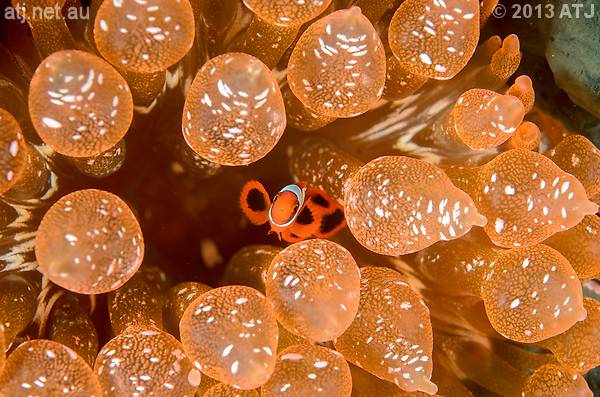 Tiny spinecheek anemonefish, Premnas biaculeatus, in a red bubble-tip anemone, Entacmaea quadricolor.