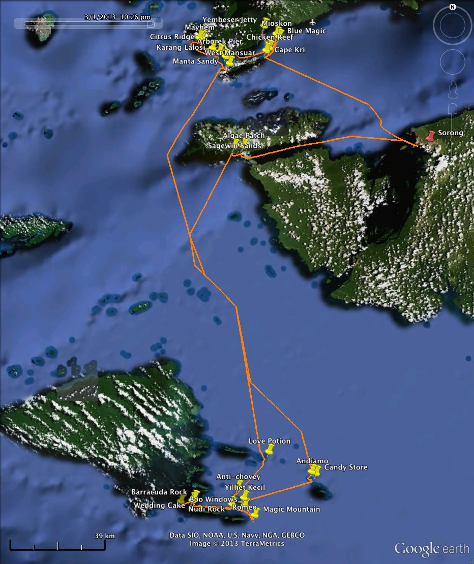 Here's a more detailed map showing where we sailed and the location of the dive sites.