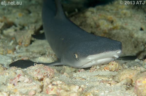 Juvenile white-tipped reef shark, Triaenodon obesus, resting under a coral head.