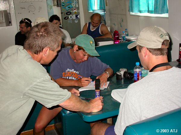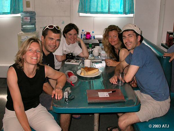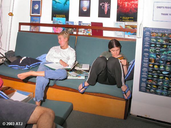 Following the dive we had a late breakfast and travelled to Steve's Bommie for the next dive. On the way, people caught up with work or sleep.